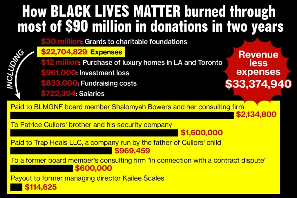 The two Black women that founded BLM were paid exorbitant salaries and expenses. $12 million went to purchase mansions in LA and Toronto. Family members were paid “consulting” fees. See chart above. This is disgraceful!