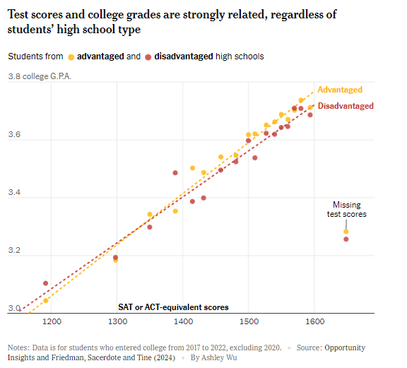 The Biden administration encouraged colleges and universities to drop standardized tests for college admissions. Instead, colleges used “life struggles” and personal essays for admissions for about 4 years. Results now show that those students did not perform well in college. Thus, the SAT’s and ACTs are back and the correlation between test scores and college GPA’s is remarkable. See graph above. And these students graduated in 4 years. Recent studies have also shown students from different backgrounds (race/gender) with similar test scores performed well in college. This is one of the reasons Trump removed DEI from college admissions.