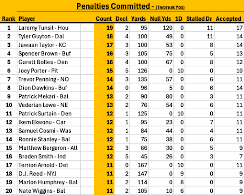 Twenty-two times yesterday the officials stopped game because of penalties. Do the players not understand the rules? Are players just undisciplined? Do they care? See below. This chart shows penalties called last year by the top offenders. Maddening!